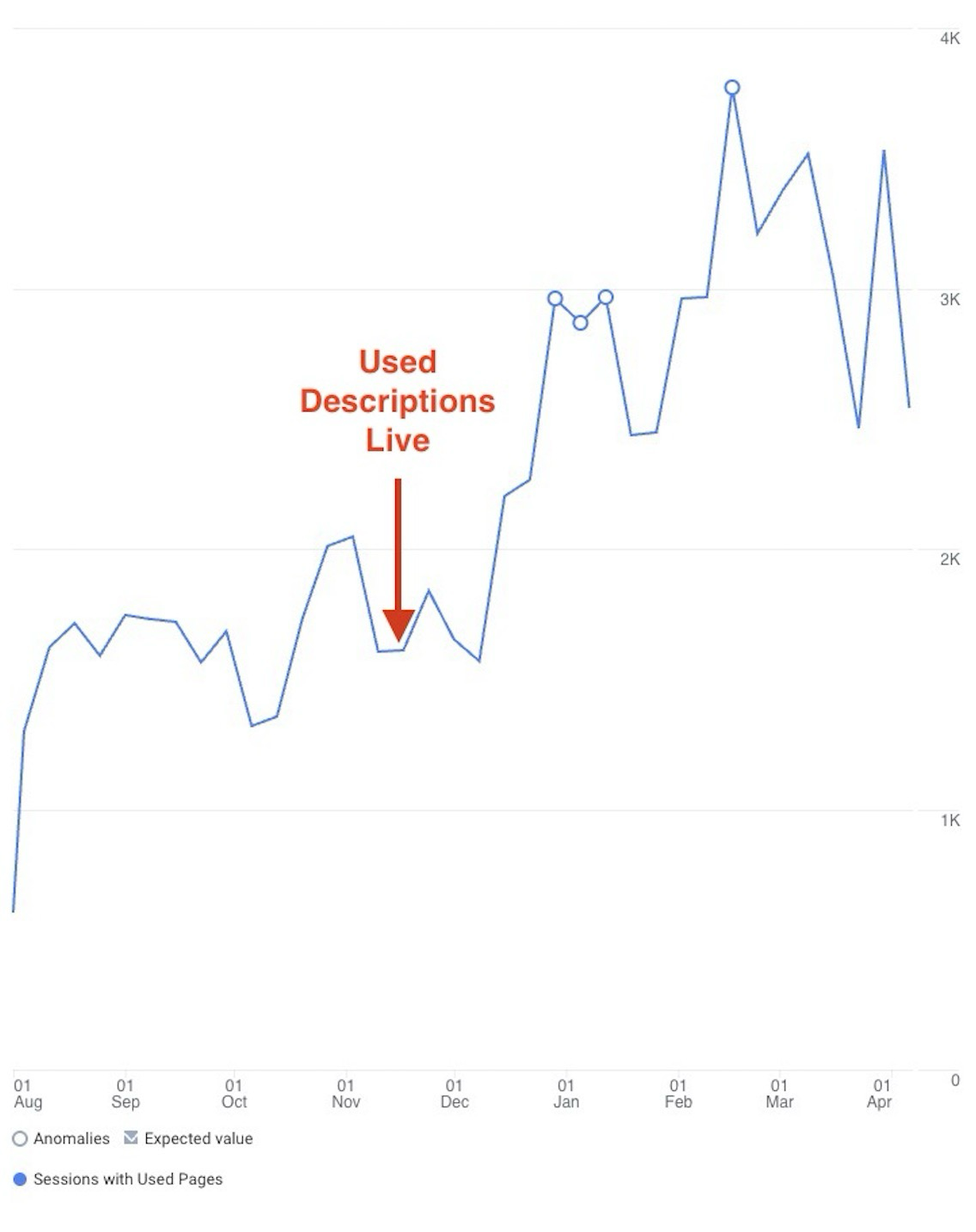 - Increased Organic Traffic (Used Cars): After activating the AI writer for used vehicles at the end of November, the dealership saw a distinct and sustained increase in organic traffic sessions to their used car VDPs, as shown in the graph below.